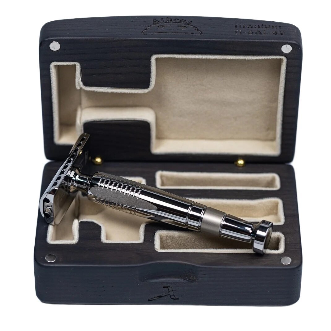 The Lambda Athena Titanium razor will arrive to its owner in a luxurious case made of Manchurian Ash (Tamo) wood, a durable, resilient and textured material. The top lid of the box bears the brand logo.