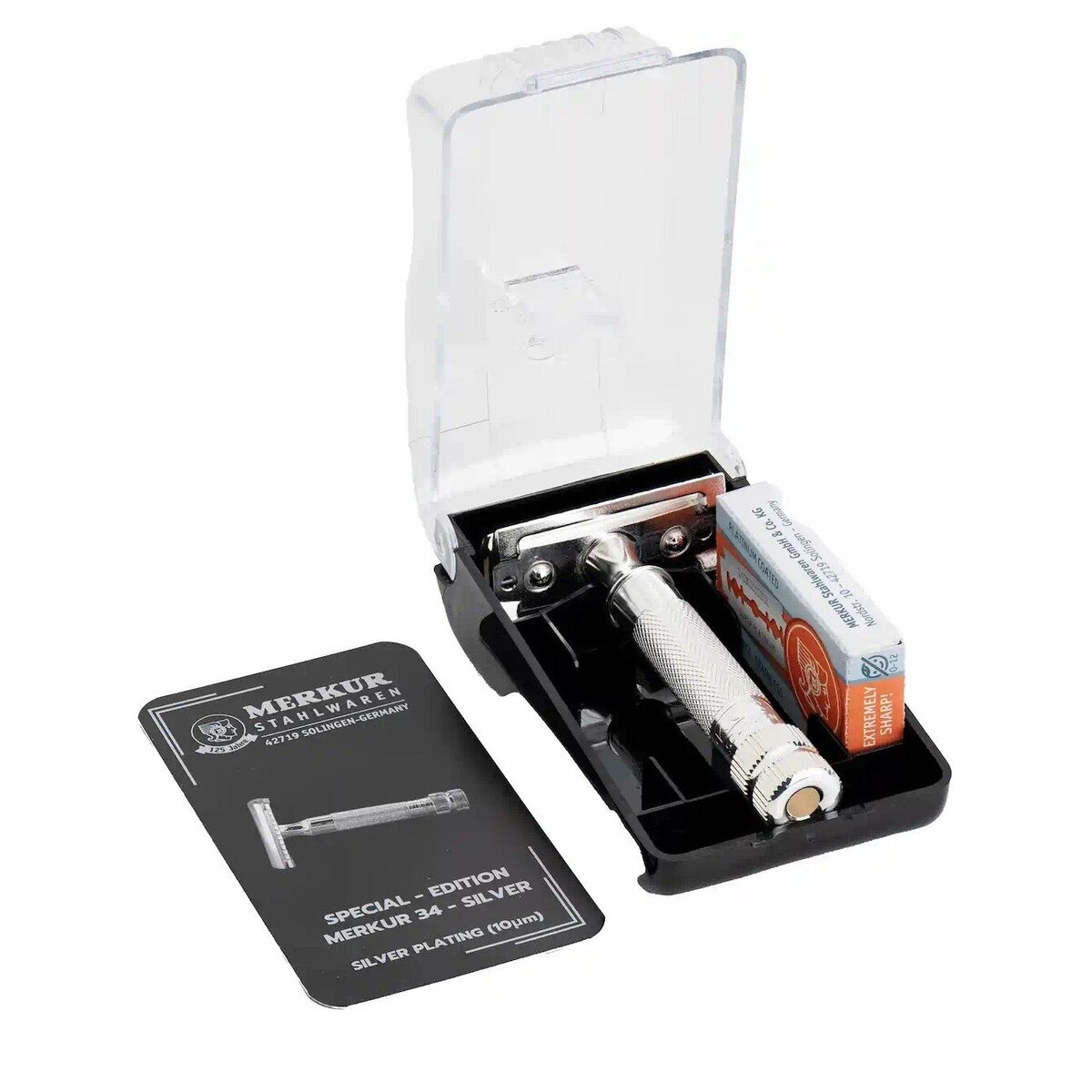 This plastic case protects your razor when storing or traveling. Suitable for all Merkur shavers with short handle, including 15, 33, 34, 41, 500 (Progress). In addition to the brand’s own models, it is perfectly compatible with other brands' razors up to 88 mm in total length, such as: REX (all models except those marked XL), The Goodfellas' smile Syntesi, Tatara Muramasa and most Fatip razors (except for extended handles — Retro, Nobile, Wood).
