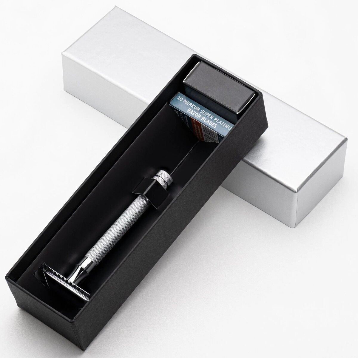 The set includes 10 Merkur branded blades — enough to last you for weeks. And the metal razor stand keeps your razor organized: it’s easy to put away after shaving, no need to hide it in a drawer, no moisture build-up.