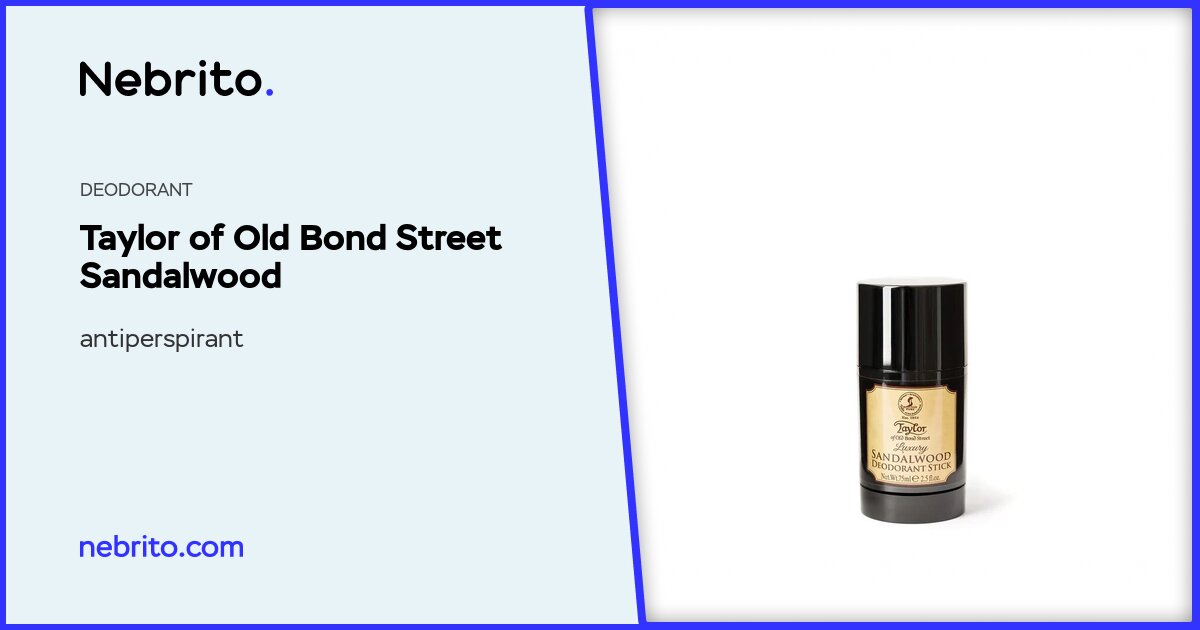 Taylor of Old Bond Street Deodorant will prevent unpleasant sweat odor and give skin a light and unobtrusive fragrance from the Sandalwood collection. Contains no aluminum salts. With vitamin E to soothe and nourish the skin.